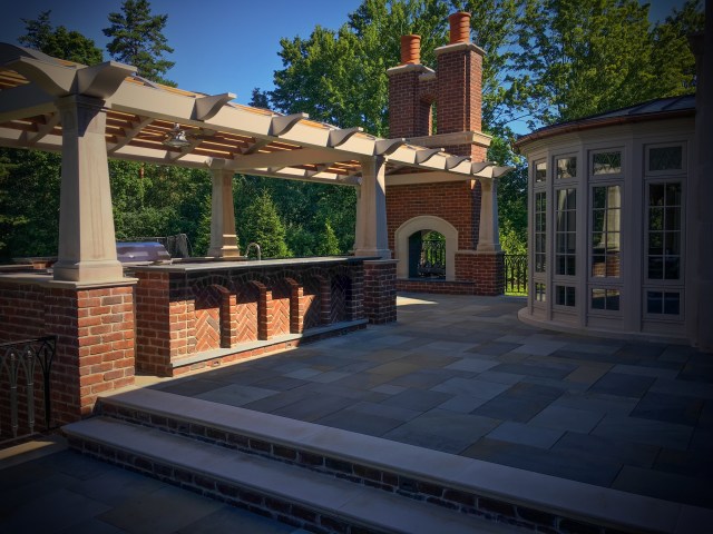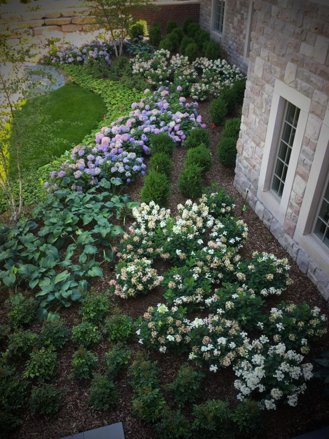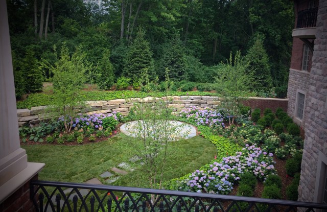 This charming garden renovation includes a bluestone installation on a beautiful new upper terrace with outdoor kitchen. A secluded natural stone fire pit is accented with hydrangeas blooming in hues of blue, various perennials and boxwood give the garden a lush structure.